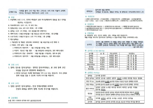 12월 28일 주보입니다~^^ 작성자 정보 더워드 작성 작성일 2025.12.27 13:57 컨텐츠 정보 17 조회 0 추천 목록 본문 12월 28일 주보입니다~^^ 0 추천 SNS 공유 관련자료 댓글 0 등록된 댓글이 없습니다. 로그인한 회원만 댓글 등록이 가능합니다. 목록