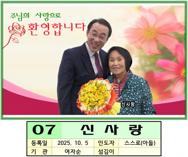 25년 10월 5일 작성자 정보 홍현준 작성 작성일 2025.10.09 19:55 컨텐츠 정보 113 조회 0 추천 목록 본문 주님의 사랑으로 환영합니다 0 추천 SNS 공유 관련자료 다음 25년 9월 21일 작성일 2025.10.02 14:06 댓글 0 등록된 댓글이 없습니다. 로그인한 회원만 댓글 등록이 가능합니다. 목록