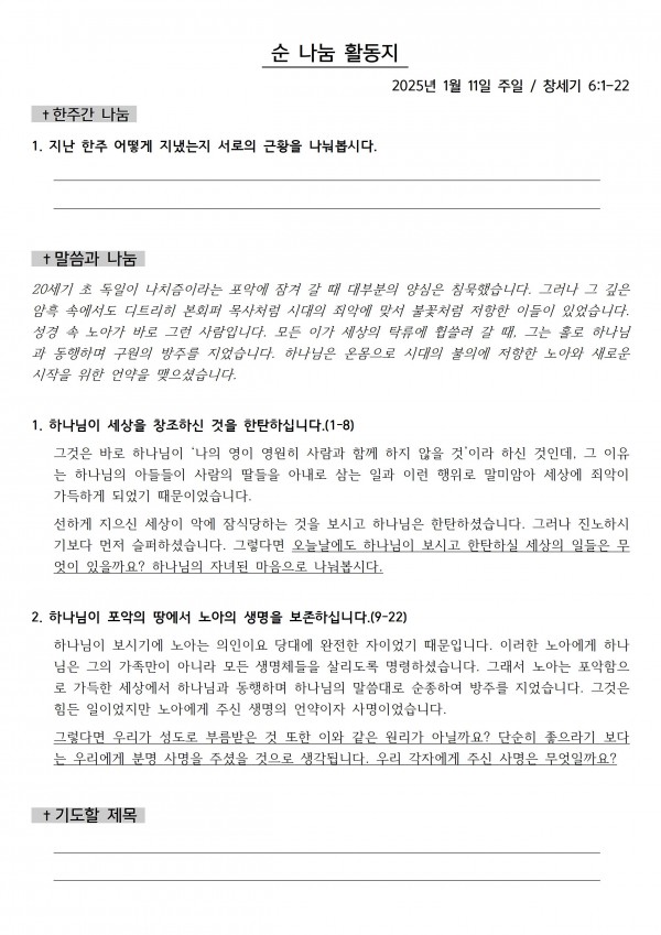 1월 둘째 주일 작성자 정보 최고관리자 작성 작성일 2026.01.23 17:04 컨텐츠 정보 6 조회 0 추천 목록 본문 순 나눔 활동지 0 추천 SNS 공유 관련자료 이전 1월 셋째 주일 / 순 나눔 활동지 작성일 2026.01.23 17:05 다음 1월 첫째주일 작성일 2026.01.23 17:04 댓글 0 등록된 댓글이 없습니다. 로그인한 회원만 댓글 등록이 가능합니다. 목록