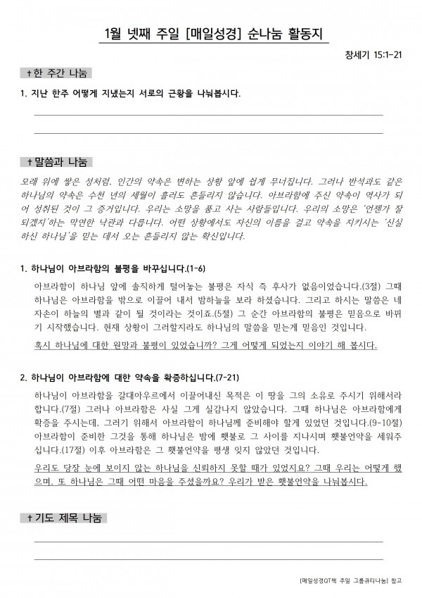 1월 넷째 주일 / 순 나눔 활동지 작성자 정보 최고관리자 작성 작성일 2026.01.23 17:06 컨텐츠 정보 6 조회 0 추천 목록 본문 순 나눔 활동지 0 추천 SNS 공유 관련자료 다음 1월 셋째 주일 / 순 나눔 활동지 작성일 2026.01.23 17:05 댓글 0 등록된 댓글이 없습니다. 로그인한 회원만 댓글 등록이 가능합니다. 목록