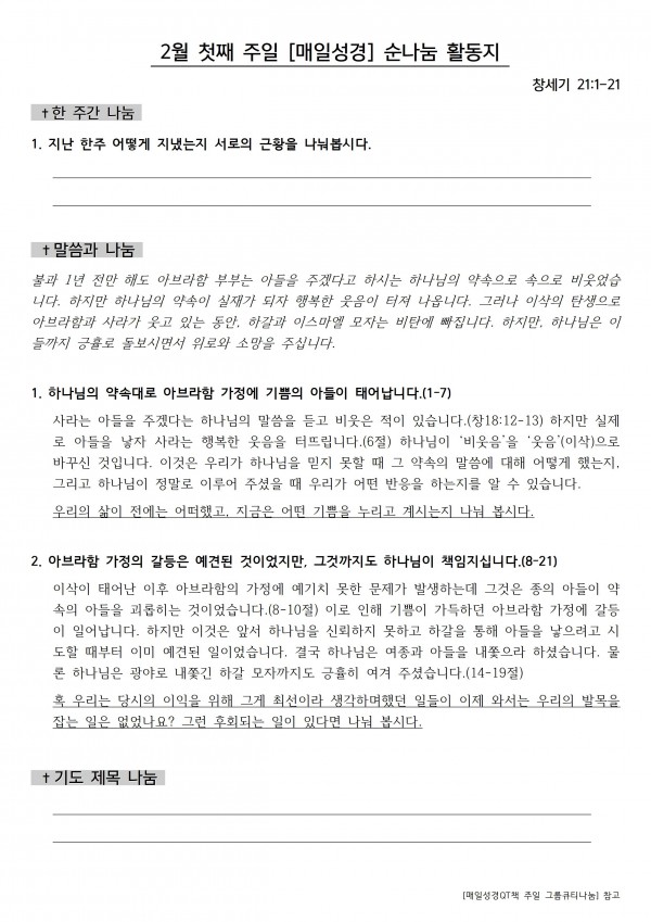 2월 첫째 주일 / 순 나눔 활동지 작성자 정보 홍현준 작성 작성일 2026.01.29 21:09 컨텐츠 정보 10 조회 0 추천 목록 본문 2월 첫째 주일 / 순 나눔 활동지 0 추천 SNS 공유 관련자료 다음 1월 넷째 주일 / 순 나눔 활동지 작성일 2026.01.23 17:06 댓글 0 등록된 댓글이 없습니다. 로그인한 회원만 댓글 등록이 가능합니다. 목록
