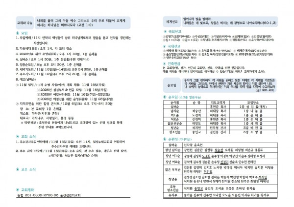 11월 9일 주보입니다~^^ 작성자 정보 더워드 작성 작성일 2025.11.08 17:17 컨텐츠 정보 3,831 조회 0 추천 목록 본문 11월 9일 주보입니다~^^ 0 추천 SNS 공유 관련자료 댓글 0 등록된 댓글이 없습니다. 로그인한 회원만 댓글 등록이 가능합니다. 목록